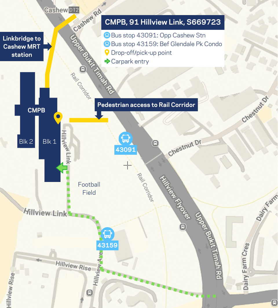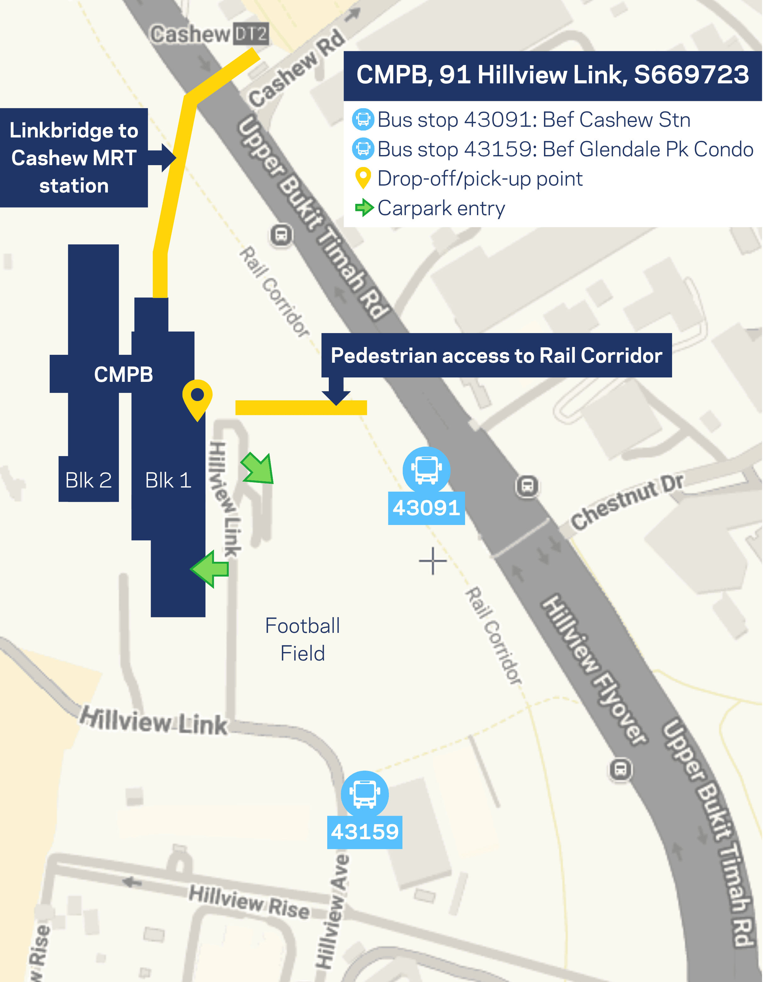 Take Exit A from Cashew MRT station and cross the linkbridge for a quick 5-minute walk to CMPB (elevator access available).